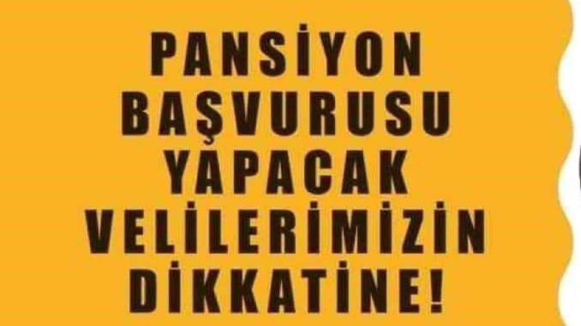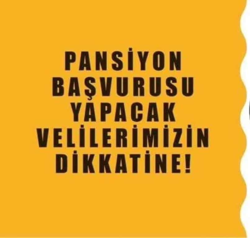 2025-2026 EĞİTİM ÖĞRETİM YILI İÇİN PANSİYON BAŞVURUSU YAPACAK ÖĞRENCİ VELİLERİMİZİN DİKKATİNE... EKTE BULUNAN PANSİYON KAYIT KILAVUZU ve EKLERİNE GÖRE İSTENEN BELGELERİ HAZIRLAYARAK 05.08.2025-22.08.2025 TARİHLERİ ARASINDA OKULUMUZA ŞAHSEN MÜRACAT ETMELERİ GEREKMEKTEDİR.