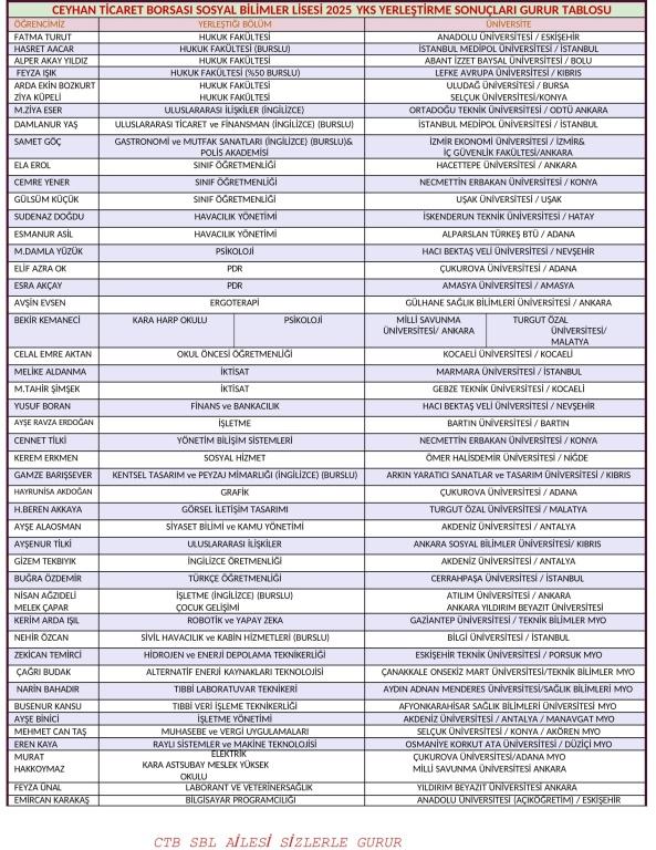 Ceyhan Ticaret Borsası Sosyal Bilimler Lisesi, Yükseköğretim Kurumları Sınavı (YKS) 2025 tercih yerleştirme sonuçlarıyla büyük bir başarıya imza attı.Okulumuz, her geçen yıl akademik başarı oranını artırarak Adana ve Türkiye çapında önemli bir eğitim markası haline gelmeye devam ediyor. Bu yükseliş, okulun akademik rehberlik, disiplinli çalışma ortamını bir arada sunan modelinin ne kadar etkili olduğunu bir kez daha ortaya koydu. Bu sonuçlar, yalnızca başarıyı değil, aynı zamanda özverili bir çalışmanın ve nitelikli eğitim anlayışının sonucunu yansıtıyor.